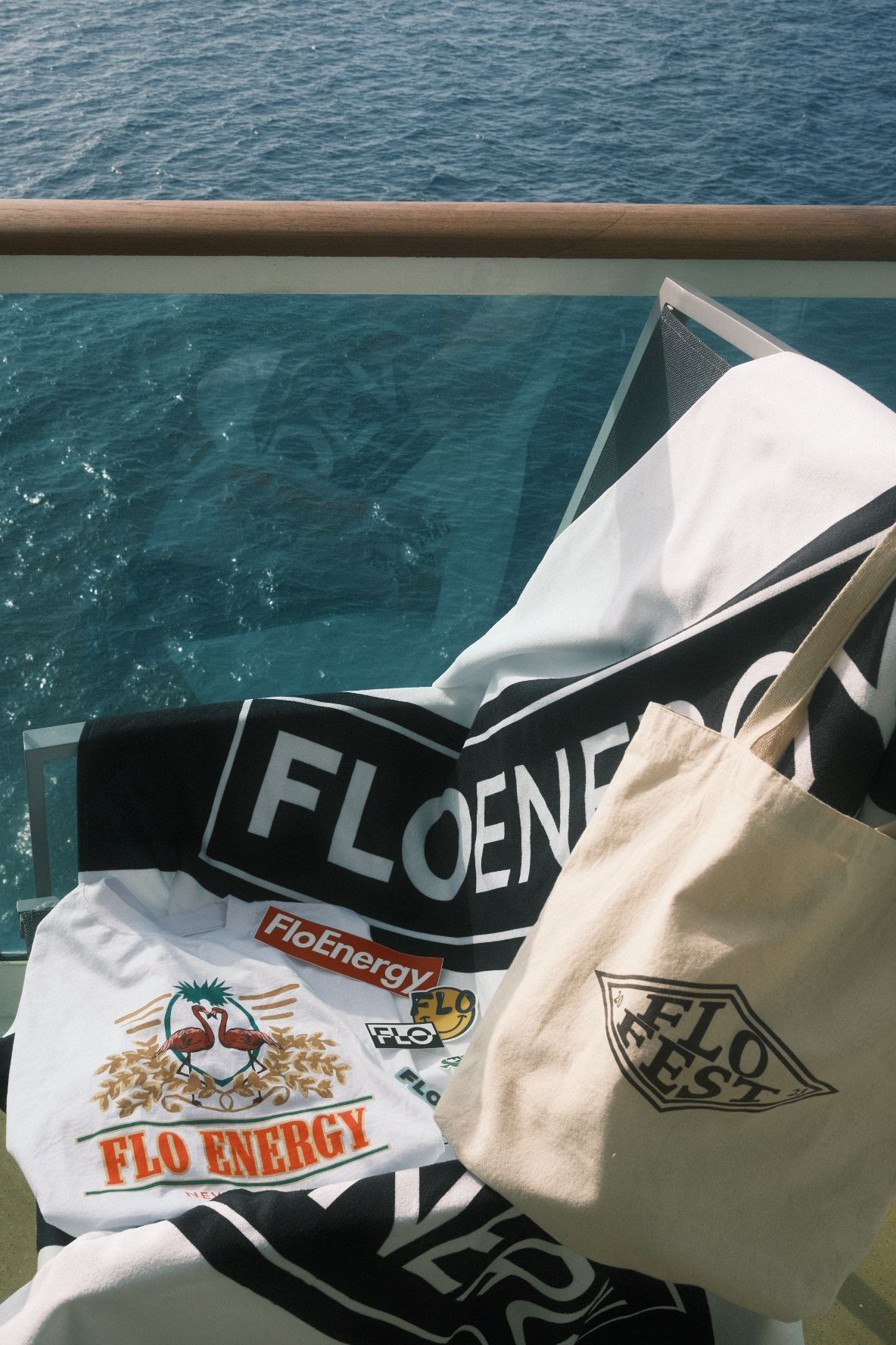 Featuring swag items from our FLO Fest Cruise at the end of the Summer Program in '23. Items include the FLO Fest Tote Bag, FLO Fest Towel, FLO Fest Tee, and FLO Stickers